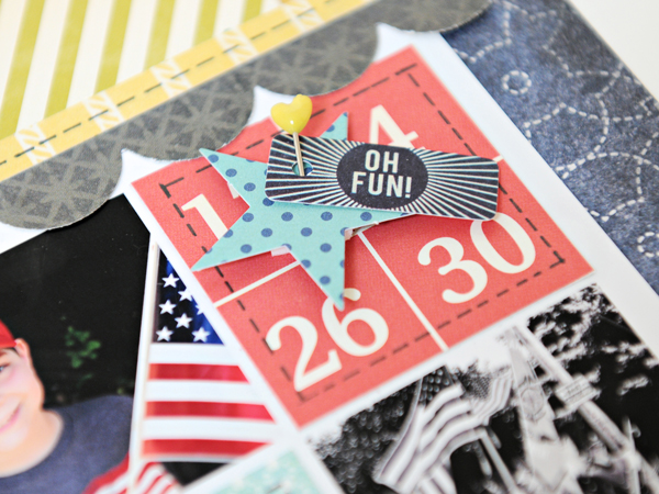 For this layout I used a mix of lots and lots of different manufacturers. I think there are 8 in all. That's pretty unusual for me since I tend to stick to collections and/or manufacturers when I scrap. Because my color scheme was pretty distinct - red, white, and blue with bits of yellow and green - it was easy to mix all of these products together and still have them look cohesive.